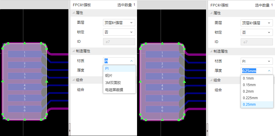 - 在放置之后,选中补强板,在属性面板设置它的材质(PI、钢片、3M双面胶、电磁屏蔽膜)、厚度/型号,这样在下单后工程人员就可以根据您设置的选项自动进行计价和生产。