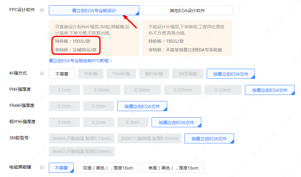 3、FPC设计软件选择“嘉立创EDA专业版设计”,不用填写补强方式,还可享受嘉立创EDA设计优惠