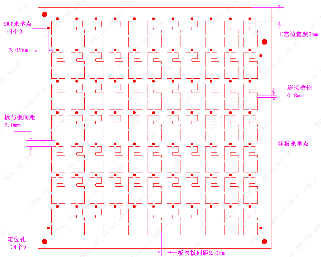 - 工艺边上增加4个直径2mm的定位孔,其中一个需错开5mm,便于防错;