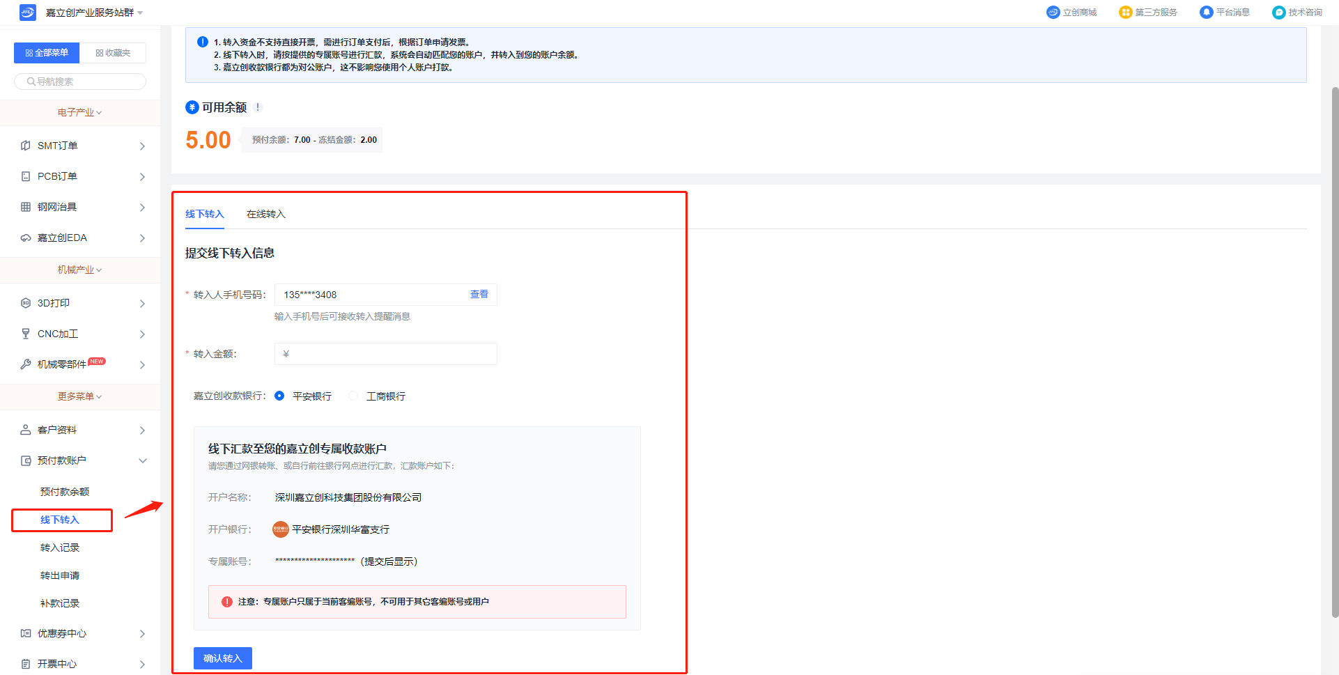 第一步:预付款账户------》线下转入------》填写对公打款金额