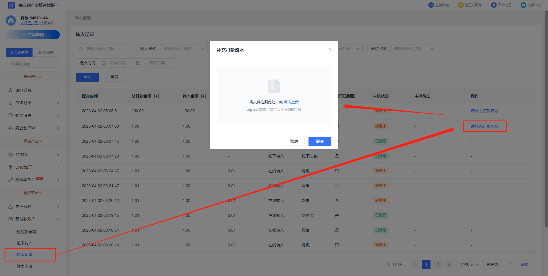 3)提交后,嘉立创财务人员会进行核实,可能需要几个小时,如果实在很急,请在QQ上直接以PCB专员联系,或以我们财务联系