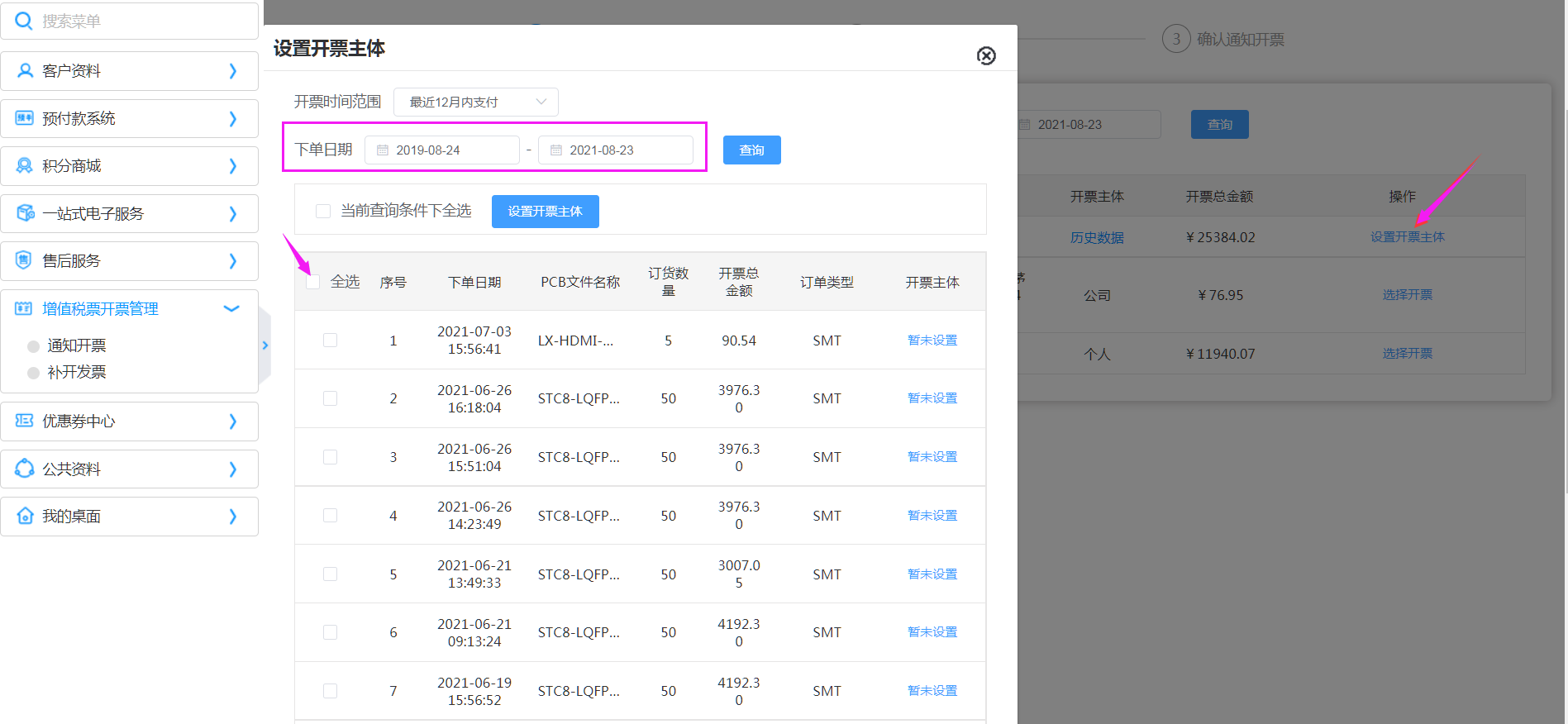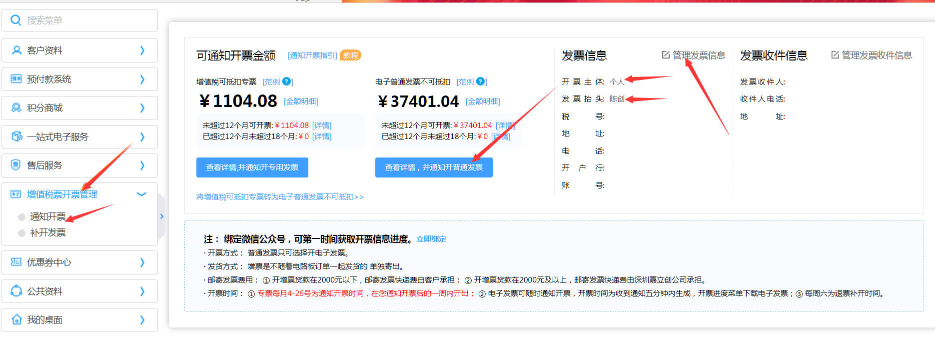 通知开票方式一:累计订单全部全部开票【通知开票】