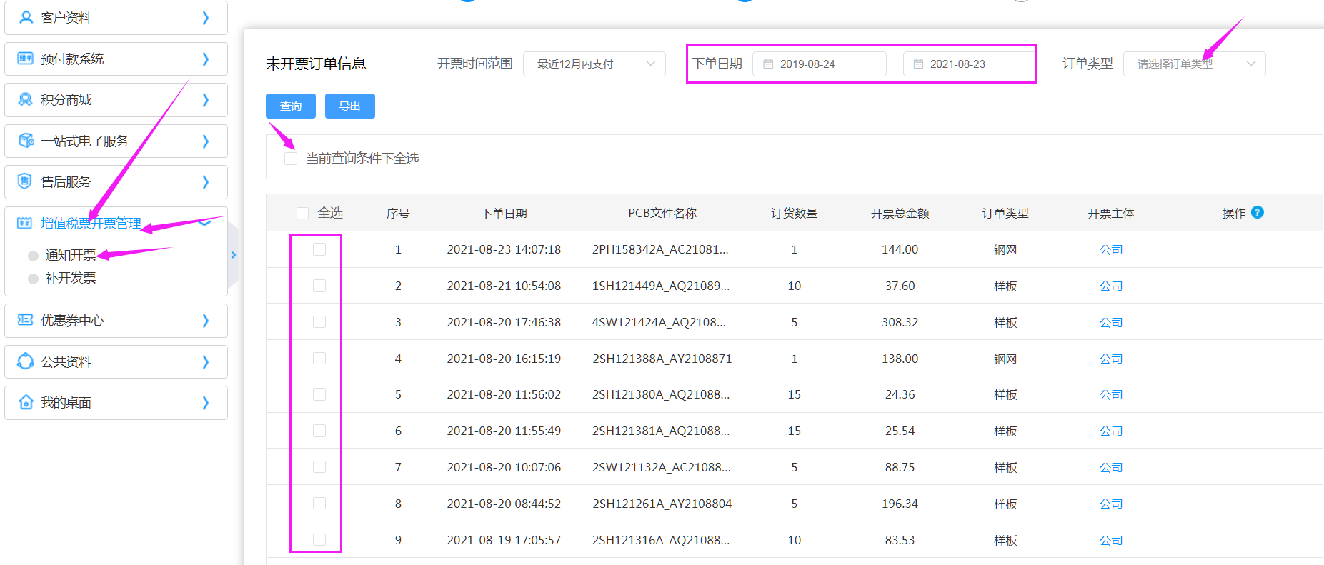 点通知开票后下一步:当选中通知开票,则弹出未开票订单信息列表,则你选中所需要的开票订单,然后点提交!