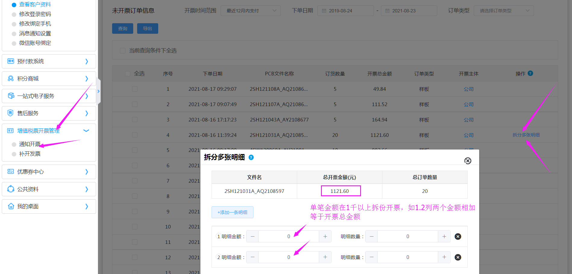 在累积开票的订单中,有一些客户,如,学校之类,一张发票金额不得超过1000的,嘉立创还提供了拆分开票功能:
