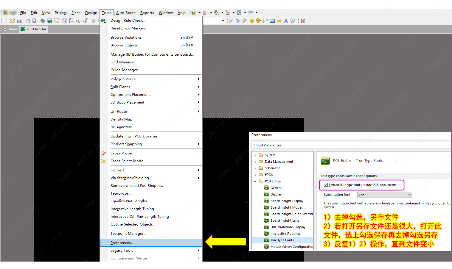 一些Altium Designer设计的PCB文件保存后文件比较大,通常是在PCB中放置了一些内嵌字体的缘故,作用是在于让其他并没有安装此类型字体的电脑可以查看到具体的字符串的内容。