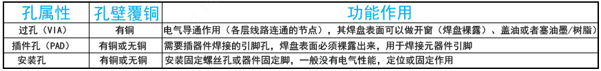 常规的电路板分“过孔”、“插件孔”、“安装孔”三种,其功能作用如下表: