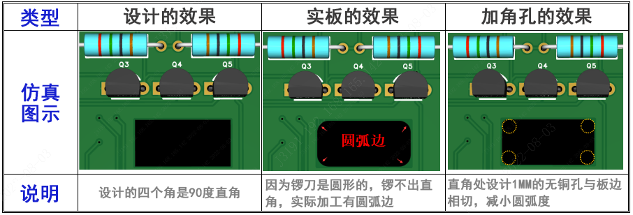 2)锣槽方式:大圆孔及异形槽孔都可以锣出来。受限于锣刀是圆形的,对于绝对直角和小夹角不能锣出来(需要添加角孔减少圆弧度)。