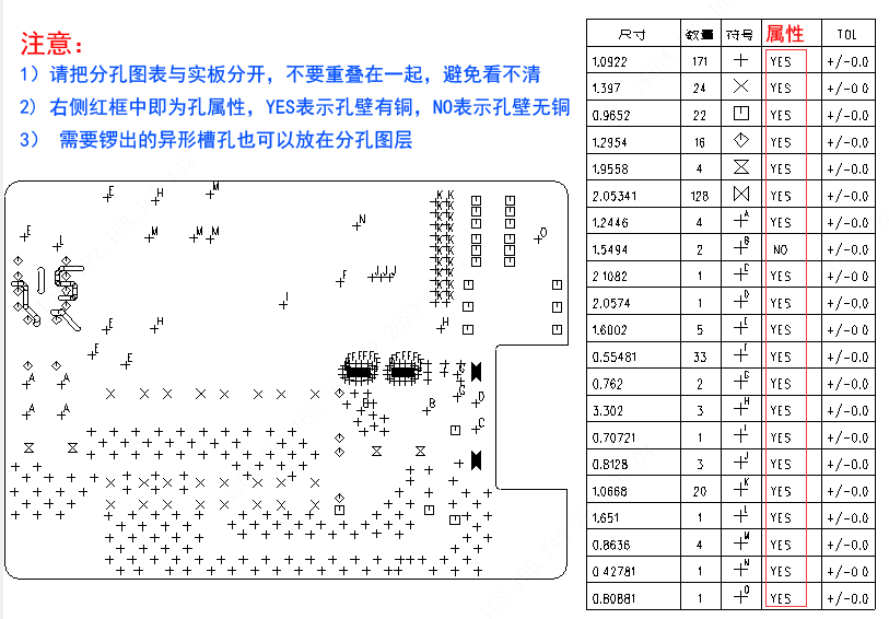 建议:在您提供GERBER时请把分孔图(DRILL DRAWING)一起加上,这样就能依分孔图辅助判断孔属性了。