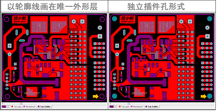 因此,请规范设计,建议有铜槽孔以钻槽孔的形式设计,无铜槽孔跟唯一外形画在同一层,并且把槽孔外侧的铜面掏开0.2MM以上。