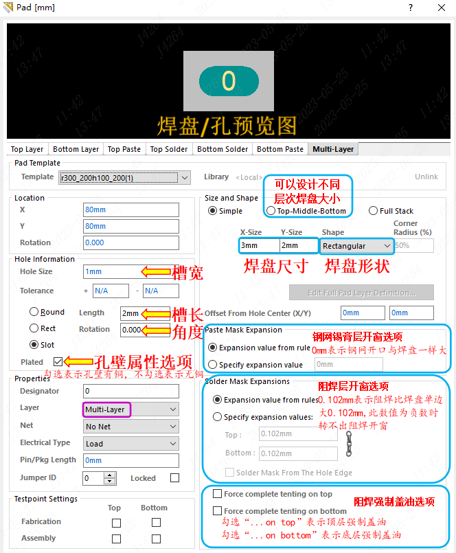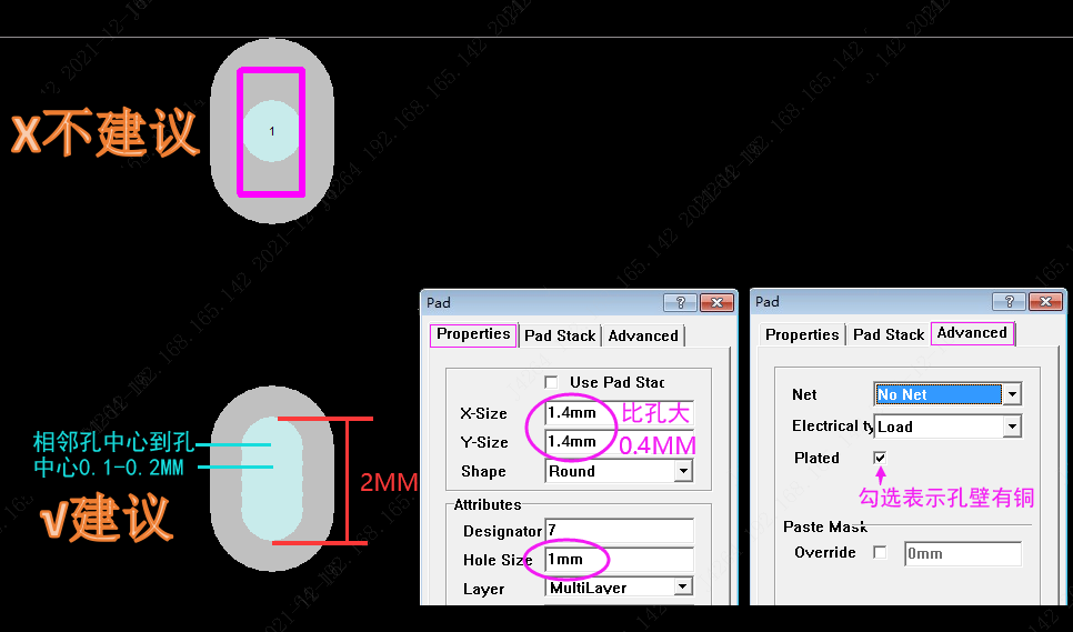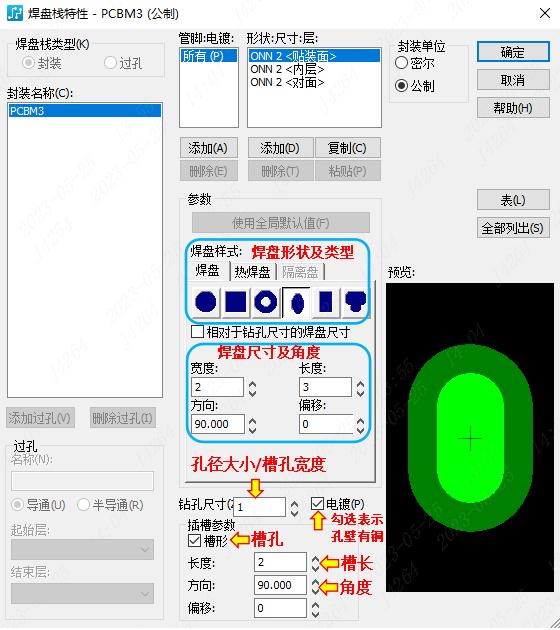 1)先画好槽孔的焊盘,然后画出多个有铜孔(勾选"plated(镀金)"表示有铜)以相叠加的方式(相邻孔中心到孔中心0.1-0.2MM),孔的大小为槽孔的宽度,两端孔边缘到孔边缘的长度为实际槽孔长度。