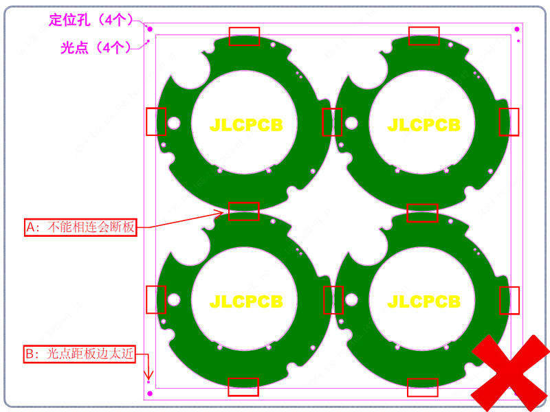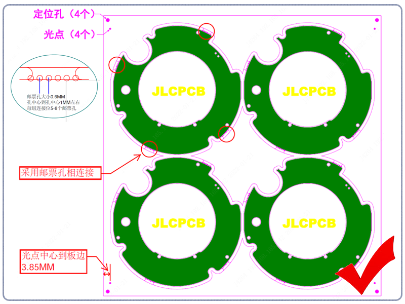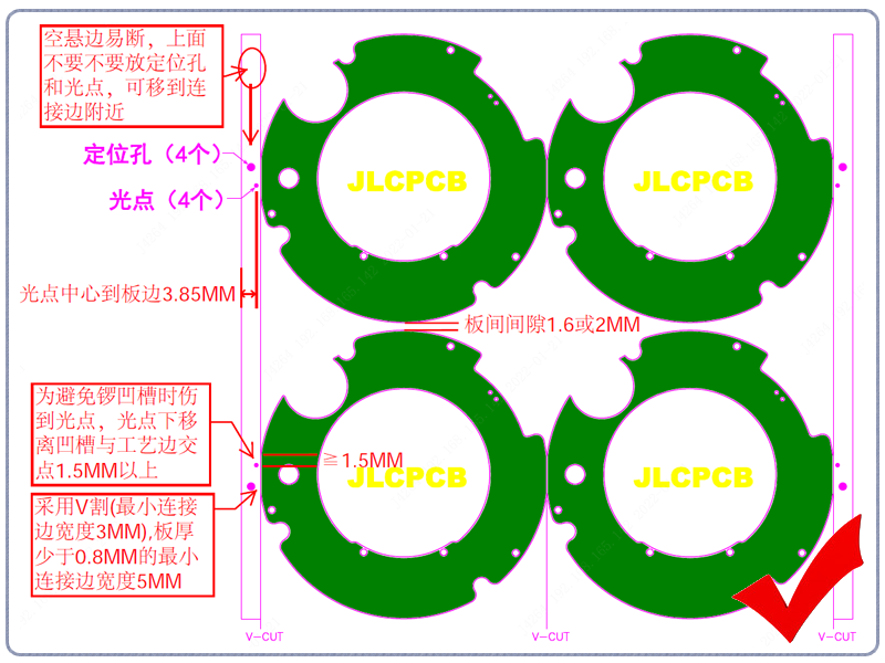 修正点:接受外形稍改动的(即把圆角处切平一部分做连接位,其长度一般为5MM左右),可以采用V割拼板。同时调整好光点位置(嘉立创SMT要求光点中心到板边3.85MM,客户自行SMT的依SMT工厂要求)