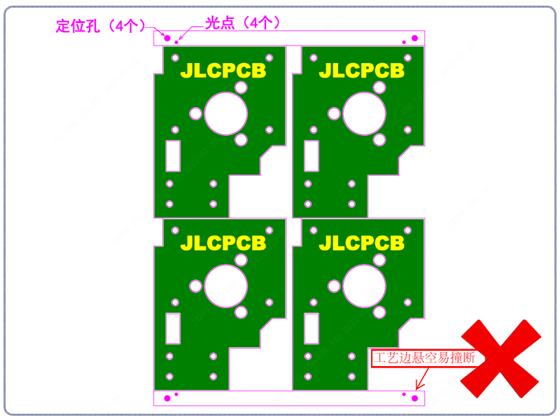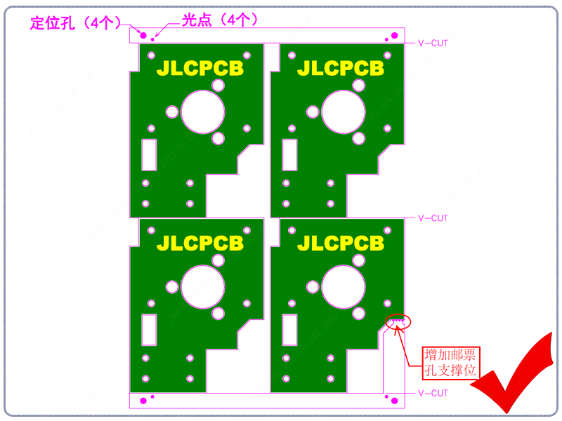 修正点:板与板间采用邮票孔拼板(邮票孔会出现齿状毛刺),同时调整好光点位置。