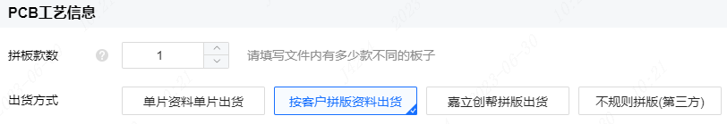 常规的矩形板,采用V割方式的且同一面同方向拼板的小批量板,可以下单时选择由嘉立创工程免费拼板: