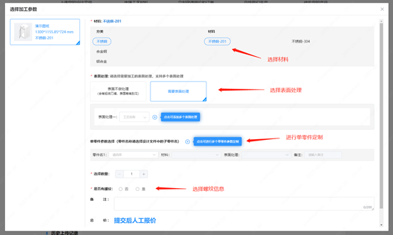 图纸上传成功后,点击选择修改参数,设置加工材料、表面处理工艺、螺纹等信息