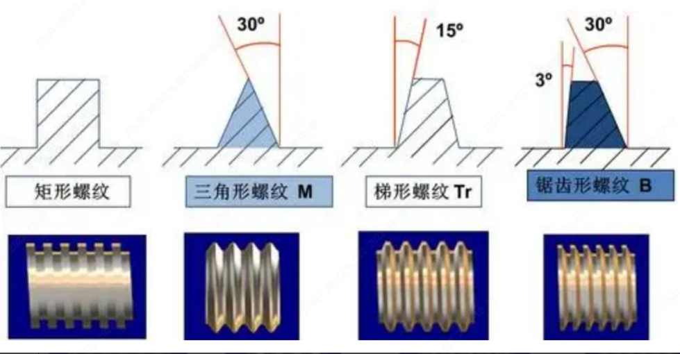 螺纹指的是在圆柱或圆锥母体表面上制出的螺旋线形的、具有特定截面的连续凸起部分。按其在母体 所处位置分为外螺纹、内螺纹,按其截面形状(牙型)分为矩形螺纹、三角形螺纹、梯形螺纹、锯齿形螺纹以及其他特殊螺纹。一般常用螺纹为三角形螺纹和梯形螺纹。
