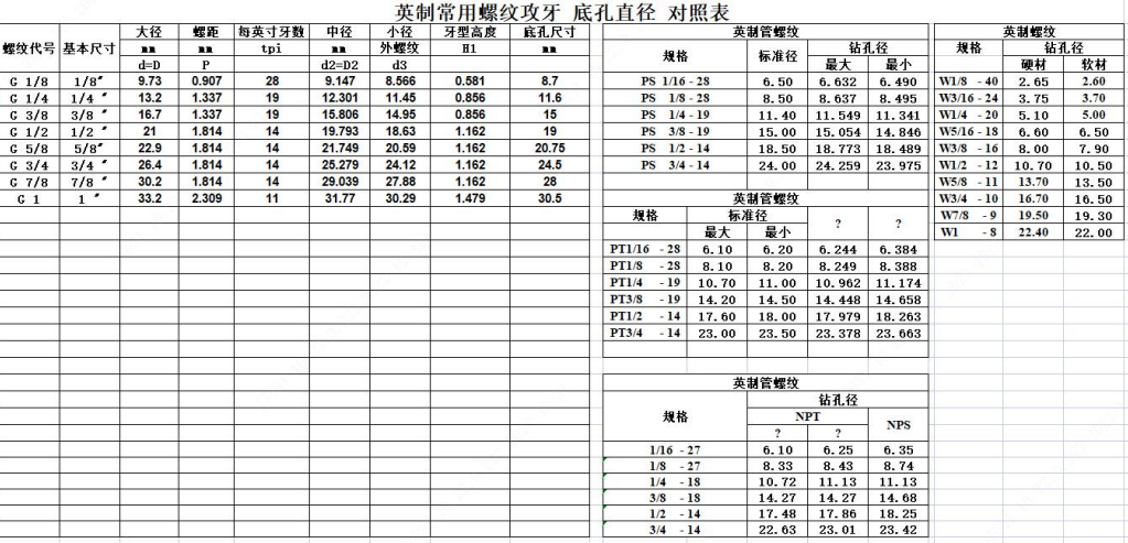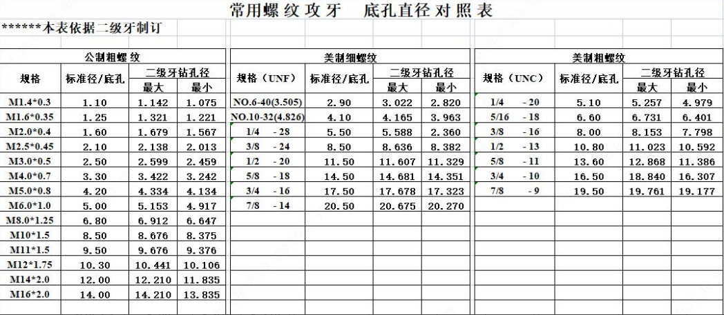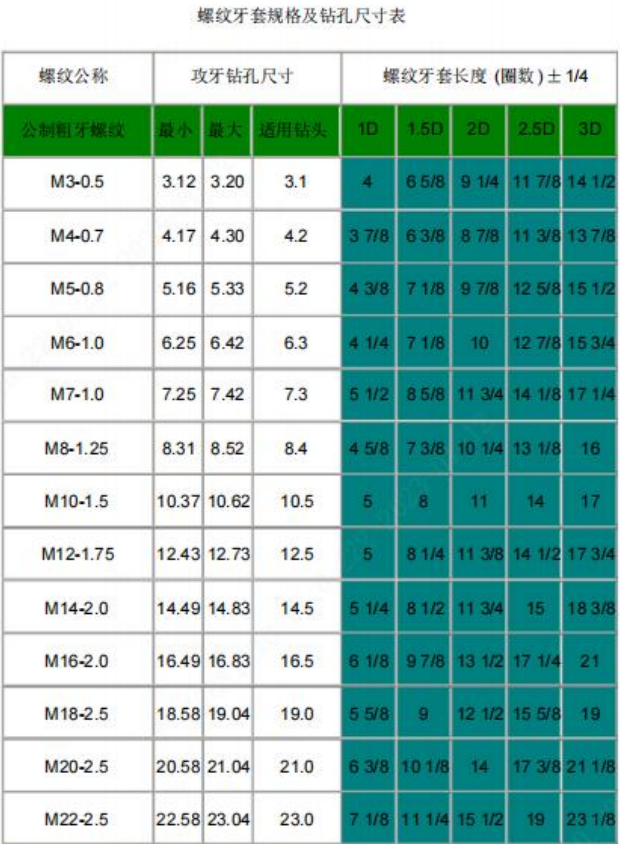 安装牙套也是要先攻牙的,安装牙套的需要的牙孔加工方法与上面介绍的螺牙加工一样,牙套的底孔与牙的规格也要按照设计的标注,各规格的牙套底孔与螺牙标准如下表;