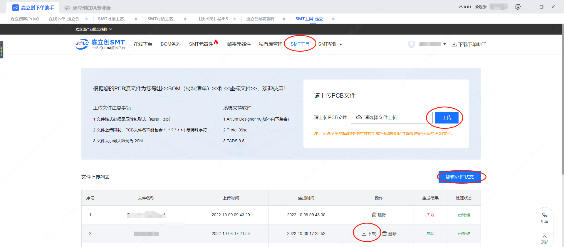 1.在【SMT订单】--【SMT工具】中,点击选择文件,上传PCB文件(文件名不要带pcb字样,否则上传不