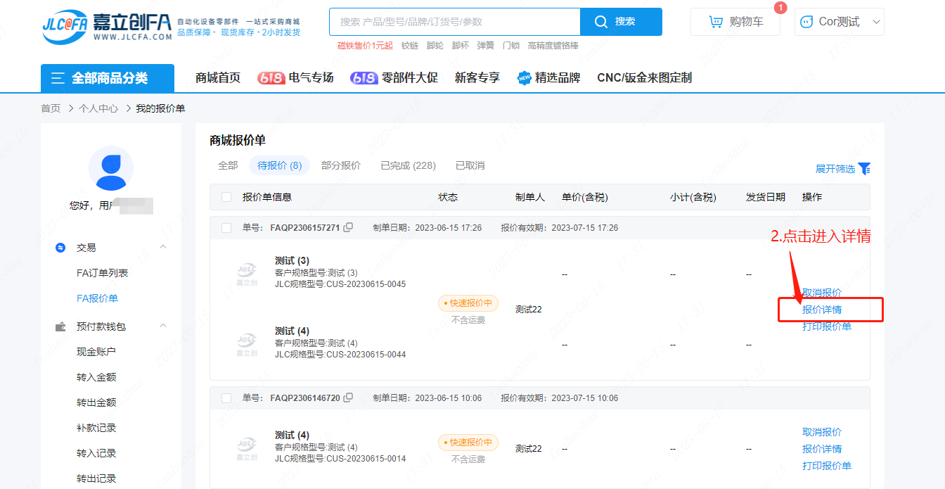 1.进入商城首页,如图点击“待报价”,进入待报价页面