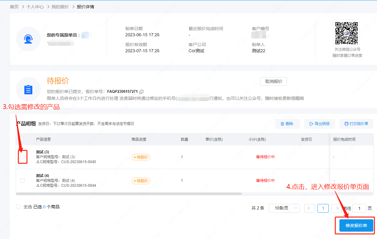 2.找到需要修改的报价单,进入该报价单的报价详情页面