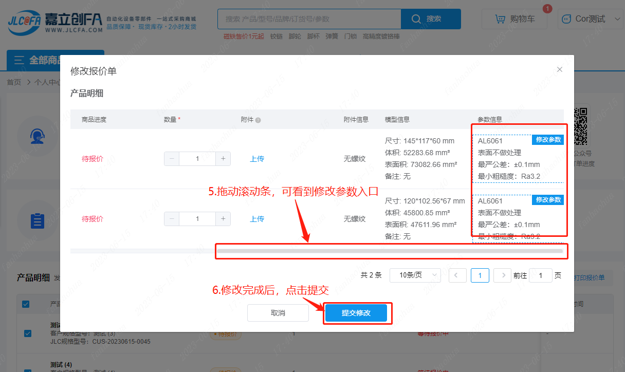 适用场景:提交报价单之后,如需更新图纸或者修改加工参数等;该流程仅适用“待报价”状态