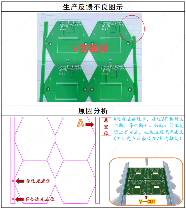 在实际生产中,V割加工板子悬空位过长易造成爆边断开,从而影响后续SMT组装元器件,在拼板时需要留意并优化好