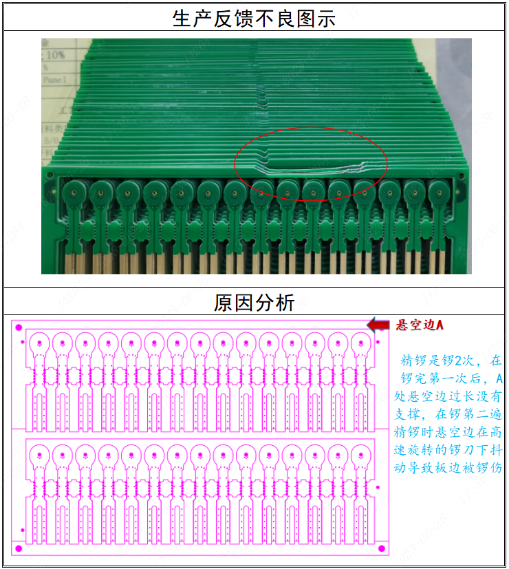 我司锣边分为精锣(公差+/-0.1MM)与粗锣(公差+/-0.2MM)两种加工方式,精锣是采用两次锣边方式来加工的,为了保证精锣定位,每个精锣单元至少需要2个以上的定位孔,在实际加工中,在锣完第一次后,因悬空边过长,第二次锣边时抖动会导致锣变形