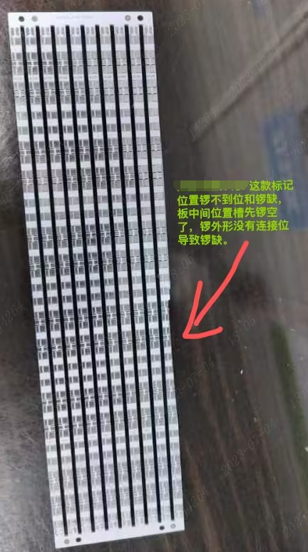其它情况: 此类长条形板,不管是普锣还是精锣,也会出现锣板不良的情况(需要每间隙一定宽度加连接位固定)