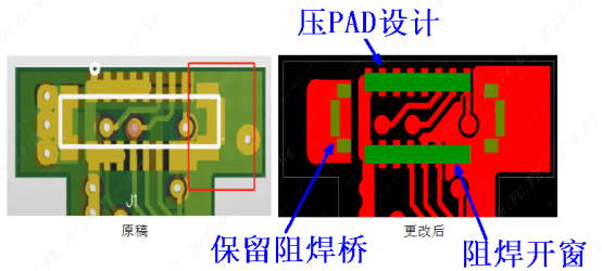 (3)焊盘脱落:连接器座子焊盘比较独立,容易脱落,建议做压PAD设计。