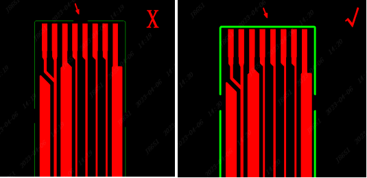 (2)焊接手指板内焊盘上的过孔不能加成一排,防止应力集中在过孔上,容易导致断裂