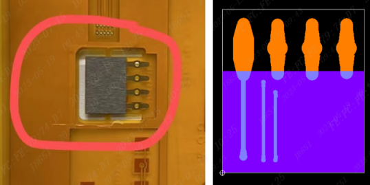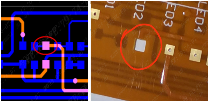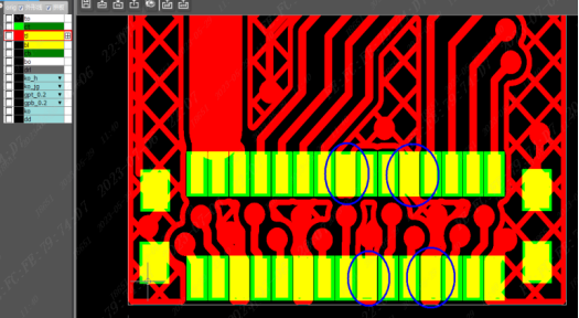 (7)因FPC是使用的阻焊膜不能像绿油一样做阻焊桥,在设计IC类焊盘时,焊盘上不能有多余的覆铜(如下图圈住的焊盘设计不合理),否则会导致焊盘变大,间距变小,焊接时容易短路。