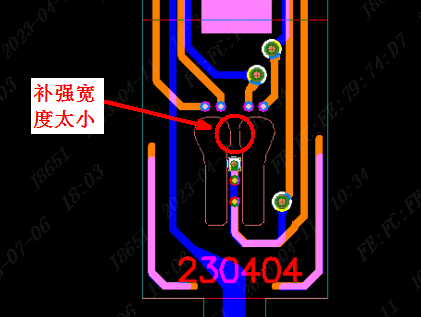 (8)补强宽度:FR4补强宽度太小,很容易断裂及碳化,建议最小宽度小于5mm的改为PI或钢片补强 。背胶最小宽度也要有3mm以上。
