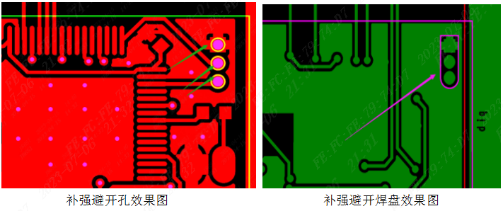 (3)补强开口设计:是指补强要避开下方的元器件孔或焊盘,最好是客户自己设计好,我司一般默认按避开焊盘0.3mm来处理,如果掏开补强后,剩下的补强宽度不够2mm的,我们会直接拉通(即这一整块区域都没有补强),注意此点我们不会提出问客单,有特殊要求要提出来。