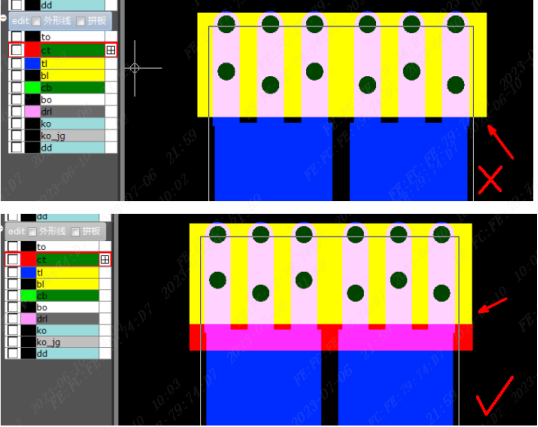 (2)拼版连接位:连接位加在金手指上,会导致金手指前端不平整。