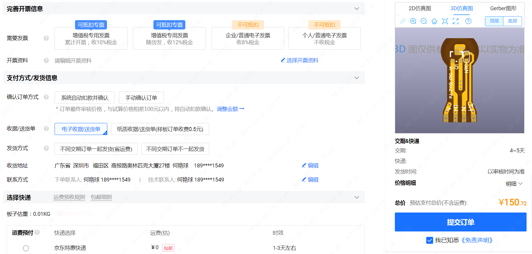 10.完善开票信息,选择快递公司,提交订单就可以了