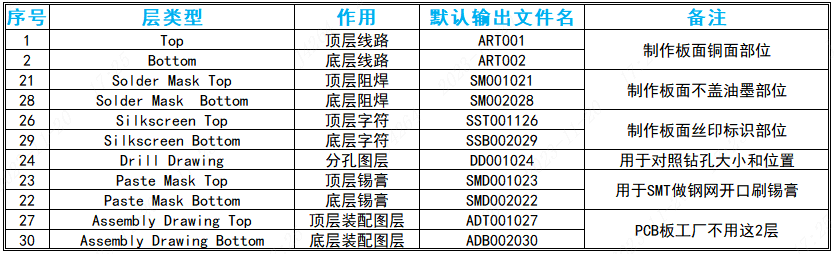 以双面板为例,其各层的常规文件名及意义如下表所示: