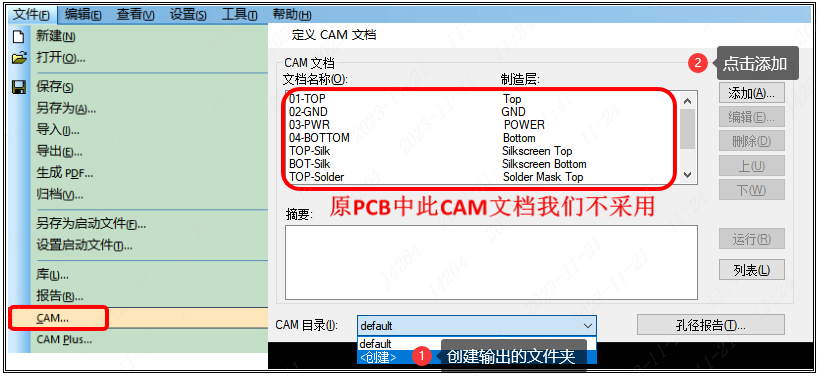 2.在板子右下角点选"文件"-"CAM"打开菜单,创建输出Gerber的文件夹后点选"添加"