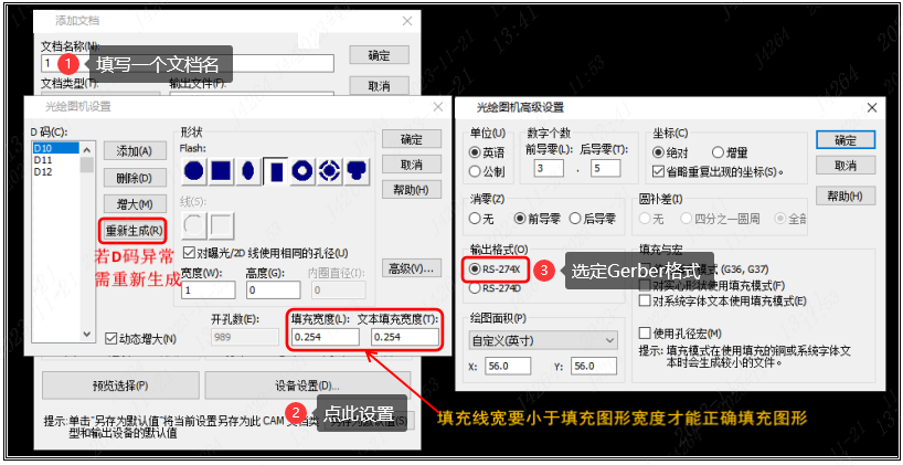 3.在"文档名称"中随意填写一个数字或字母名,同时点选"设备设置"确定好D码表、填充线宽和RS-274X格式