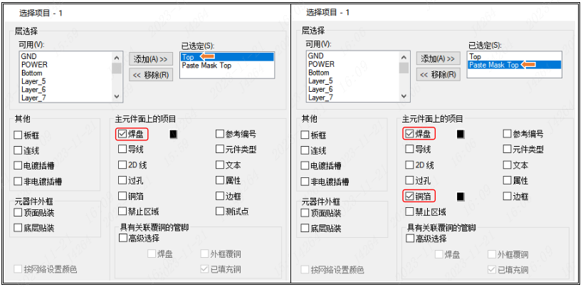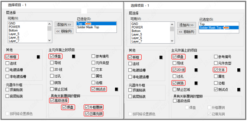 注意:① 输出Gerber下单的输出阻焊层是含有2个关联层,每个关联层都要选择好