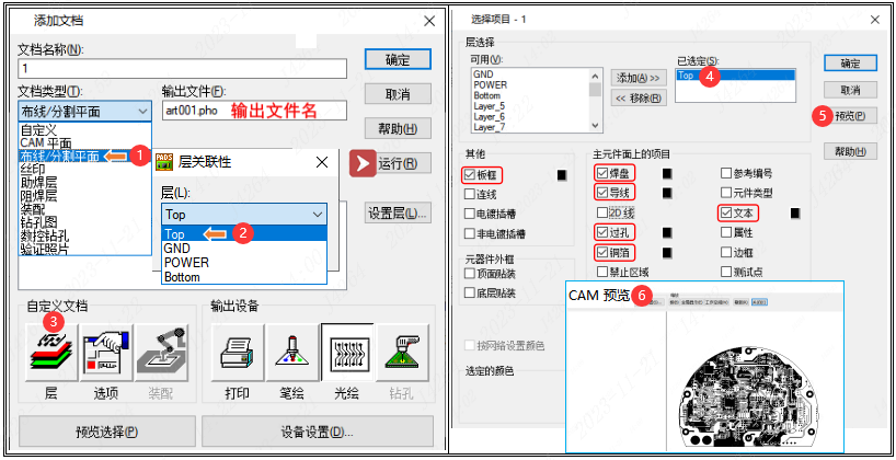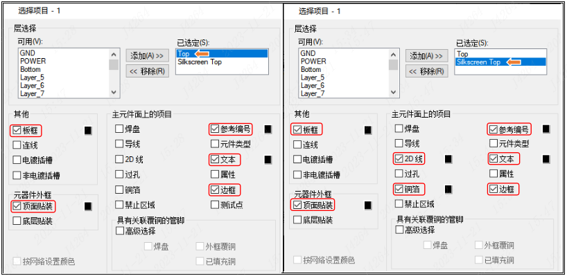 注意:① 输出Gerber下单的输出字符层是含有2个关联层,每个关联层都要选择好