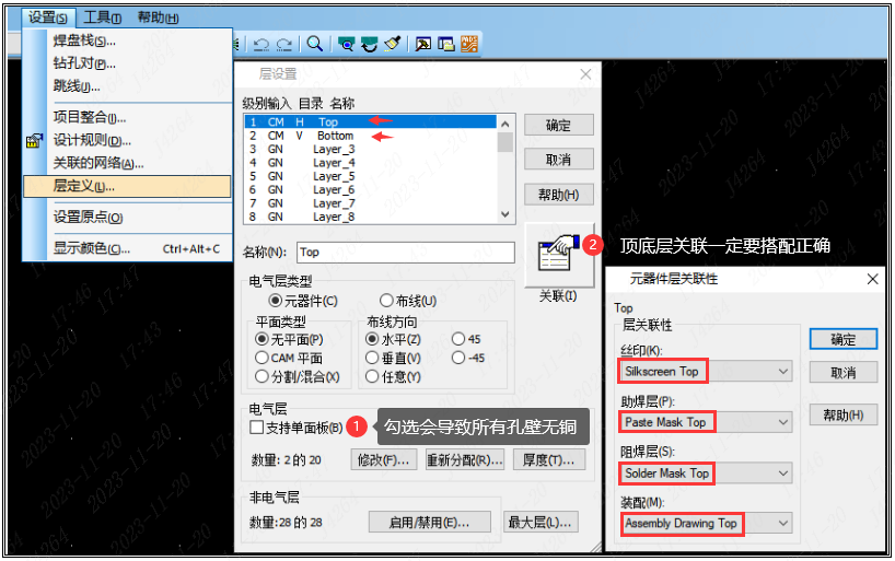 ★重点提示1:在"层设置"菜单中检查好电气层属性与关联层次