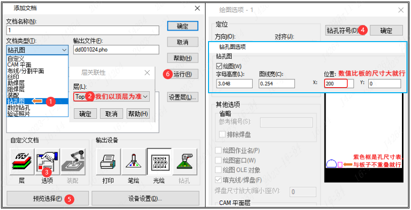 7.输出钻孔图:按照图示选择"顶层"钻孔图,同时设置好板与孔尺寸表分开不重叠,然后预览检查无误后,点"运行"输出
